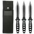 Features 7 7/8″ overall, with 4″ edged blades. One piece black coated stainless construction with two toned black and silver blades. Slot cutout design handle. Black nylon belt sheath holds all knives. Triple Thrower Set. Includes three throwers. Made in China.