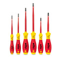 The German made Wiha VDE / 1000V Screwdriver has a multi component Softfinish handle which provides maximum user comfort. It features up to 33% reduction of the bit diameter in critical working areas allowing effortless access to low lying terminals. In addition, it has a long lifespan through its hardened blade of chrome-vanadium molybdenum steel. Testing: Each screwdriver is individually tested in a water bath at 10,000 volts in accordance to IEC60900:2012. Certified: GS, IEC and VDE.