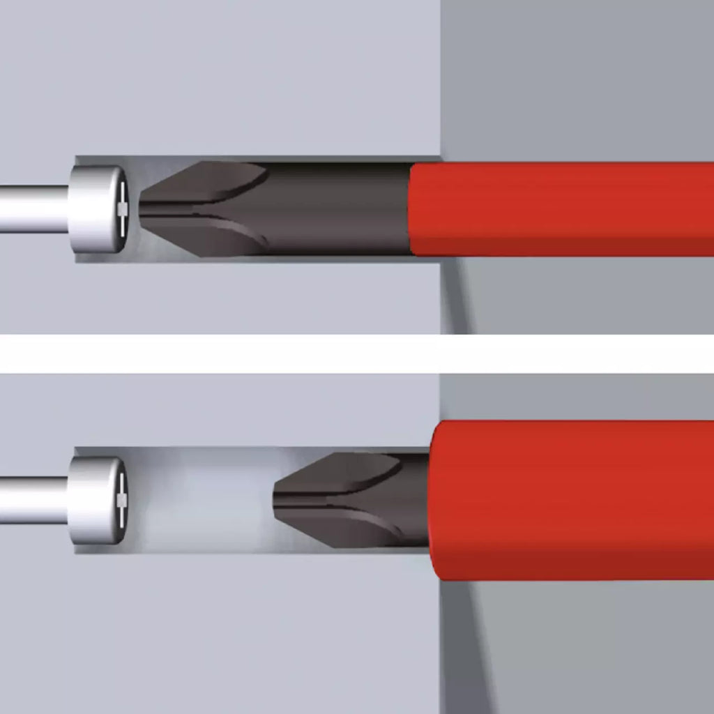 Fastening screws by hand causes considerable strain on wrists and muscles in the long term. The highly ergonomically shaped SoftFinish® screwdriver provides a remedy, ensuring optimal transmission of hand force. The long, slender handle sizes can be used to fasten small screws quickly and firmly. There are also large handle sizes to fasten large screws which can be used to apply greater torques. The various handle sizes have also been matched to the consistently same-sized hand of screw-fastening professionals. The roll-off protection and screw symbol printed on the handle end ensure users work efficiently. Protective insulation has been integrated into the blade with the Wiha slimTECHNOLOGY specially developed for electric applications, thus ensuring blades which are up to 33% slimmer. This means low-lying screw and spring elements can also be easily reached. These insulated screwdrivers undergo routine individual piece testing as per the international IEC 60900 standard, as a result * providing users with a tool to work safely on live parts up to 1,000 V AC.
