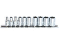 Set includes:, 4, 5, 6, 7, 8, 9, 10, 11, 12 & 13mm Sockets, 1 x Socket Rail