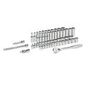 Our MILWAUKEE SAE & Metric 56 piece 3/8" drive Ratchet & Socket set is designed from the ground up, offering our users the Most Versatile Sockets that are Anti-Roll and Wrench-Ready. Its innovative FOUR FLAT Sides feature an anti-roll and wrench-ready design. The 90 tooth ratchet tool offers 4° of arc swing and a slim profile design, allowing you to work in tighter and more confined spaces, be it under the hood of a car or in the middle of a remodel. The ratchet and socket kit comes with a removable inner tray which is perfectly designed to be stored long-term in a steel storage chest. All of our sockets are stamped with metric and SAE measurements on the flat side for easy-to-read visibility. It also comes with a durable carrying case for ultimate portability. The set comes with accessories included so that our users can get every job done, both in the garage and on the jobsite. Our ratchet and socket set is backed by our Lifetime Guarantee.