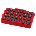The Milwaukee® SHOCKWAVE™ 1/2" Drive 27 Piece Metric + SAE Standard Impact Socket Tray Set features the boldest, longest-lasting markings and extreme impact durability in high torque applications. The stamped and ink-filled size markings make it easy to select the right socket every time throughout the life of the socket. Engineered with high strength forged steel for optimised performance in heavy-duty applications, and a non-slip hex geometry prevents fastener rounding. The dual-hole design and ring groove allow for easy socket attachment and removal. All SHOCKWAVE™ Impact Duty™ Sockets are backed by a Lifetime Guarantee and meet ASME industry standards.