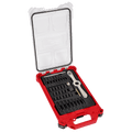 The MILWAUKEE 38-Piece Metric Tap & Die PACKOUT™ Set includes precision machined threading accessories and a versatile Hex- LOK™ 2-in-1 Handle for the most common applications. The set features 17 straight-flute taps and 17 1” hex dies with long-lasting laser-etched sizing for clear markings and includes a protective Black Oxide coating for corrosion resistance. The Hex-LOK™ 2-in-1 Handle combines the benefit of both internal and external threading within one handle by its compatibility with both 1” hex dies and the MILWAUKEE tap collet. The handle’s ergonomic grip is designed to deliver ultimate user comfort while cutting threads. The all-metal construction allows for tool-free die and tap collet changes and is optimised for maximum balance and control when threading. The Plug Taps square shank is compatible with all standard tap handles or tap wrenches and is designed for through-hole threading. The Hex Dies 1” hex shape is compatible with the Hex-LOK™ 2-in-1 Handle, as well as all standard 1” Hex Die stocks. Our Taps and Dies are designed for cutting threads in the most common metal applications including brass, aluminium, mild steel, and more. For best results, use with cutting fluid. The set is organised in a PACKOUT™ Low-Profile Compact Organizer and includes a removable storage tray for versatile storage.