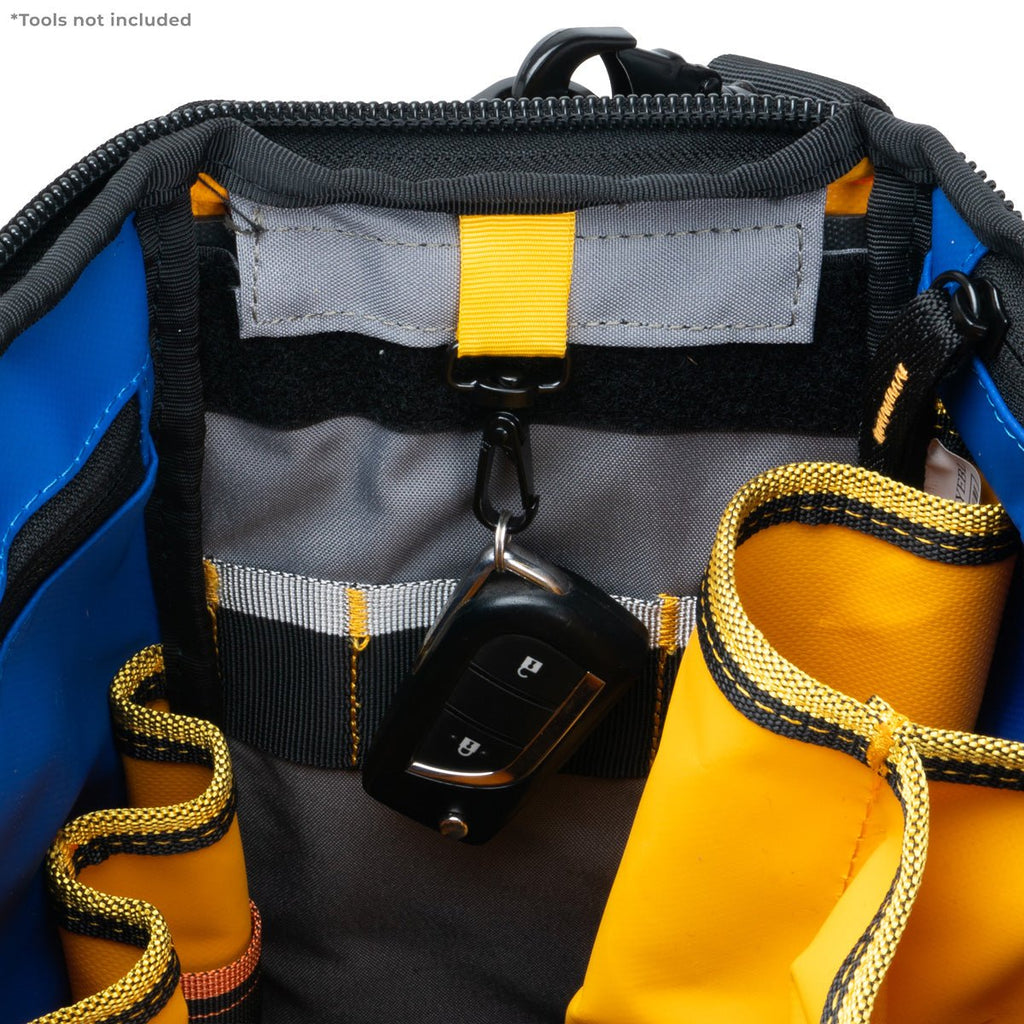 - Large main compartment with pockets, tool loops, and removable divider