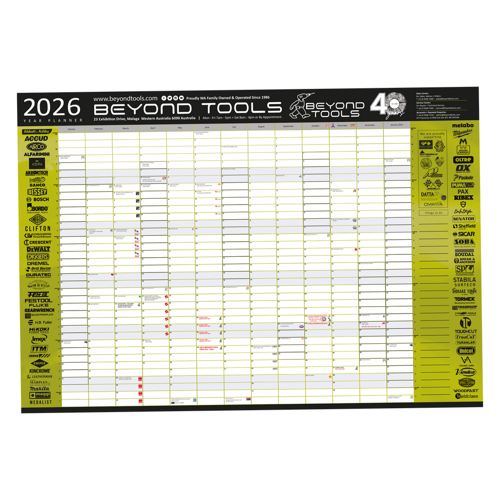 The Beyond Tools 2026 Wall Planner is a clear, easy-to-read annual planner designed for busy workshops, offices, classrooms, and job sites. With the full year visible at a glance, it’s the perfect tool for planning projects, tracking deadlines, booking jobs, and coordinating teams.