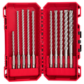 Milwaukee® SDS Plus MX4 4-Cut drill bits are the professional solution to tackle reinforced concrete drilling with its target tip technology: sharper angled tip for exact spot drilling and a solid 4-cutter Carbide head (on Ø5-10mm) to deliver speed optimisation, longer life and maximum durability in rebar. The high volume four flute design ensures enhanced dust extraction that results in faster drilling and less wear. The variable flute design gets thicker towards the core to increase flute durability.