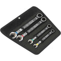 High quality combination ratchet wrench set by Wera: everything that a wrench has to be able to do. And a whole lot more. Faster, better, stylish. Yes, a real Joker. The new generation of combination ratchet wrenches. 4-piece set in a robust pouch. Suitable for hexagon bolt heads or nuts. Comes with a holding function, thanks to the metal plate in the jaw, which reduces the risk of dropping nuts and bolts. The replaceable metal plate in the jaw secures nuts and bolts with its extra hard teeth and limits the danger of slipping. The integrated limit stop prevents any slipping down around the bolt head and allows higher torque to be applied. The double-hex geometry makes for a positive connection with nuts or bolts and reduces the risk of slipping. A return angle of only 30° at the open end prevents any time consuming flipping of the wrench during fastening jobs. The ratchet mechanism at the ring end, with an exceptional, fine-tooth mechanism - 80 teeth in all - enables flexibility even in very confined working spaces. The specially forged geometry provides for high torque transfer and strength. Manufactured out of high performance chrome molybdenum steel with a nickel-chrome coating for high corrosion protection. "Take it easy" Tool Finder with colour coding according to sizes.