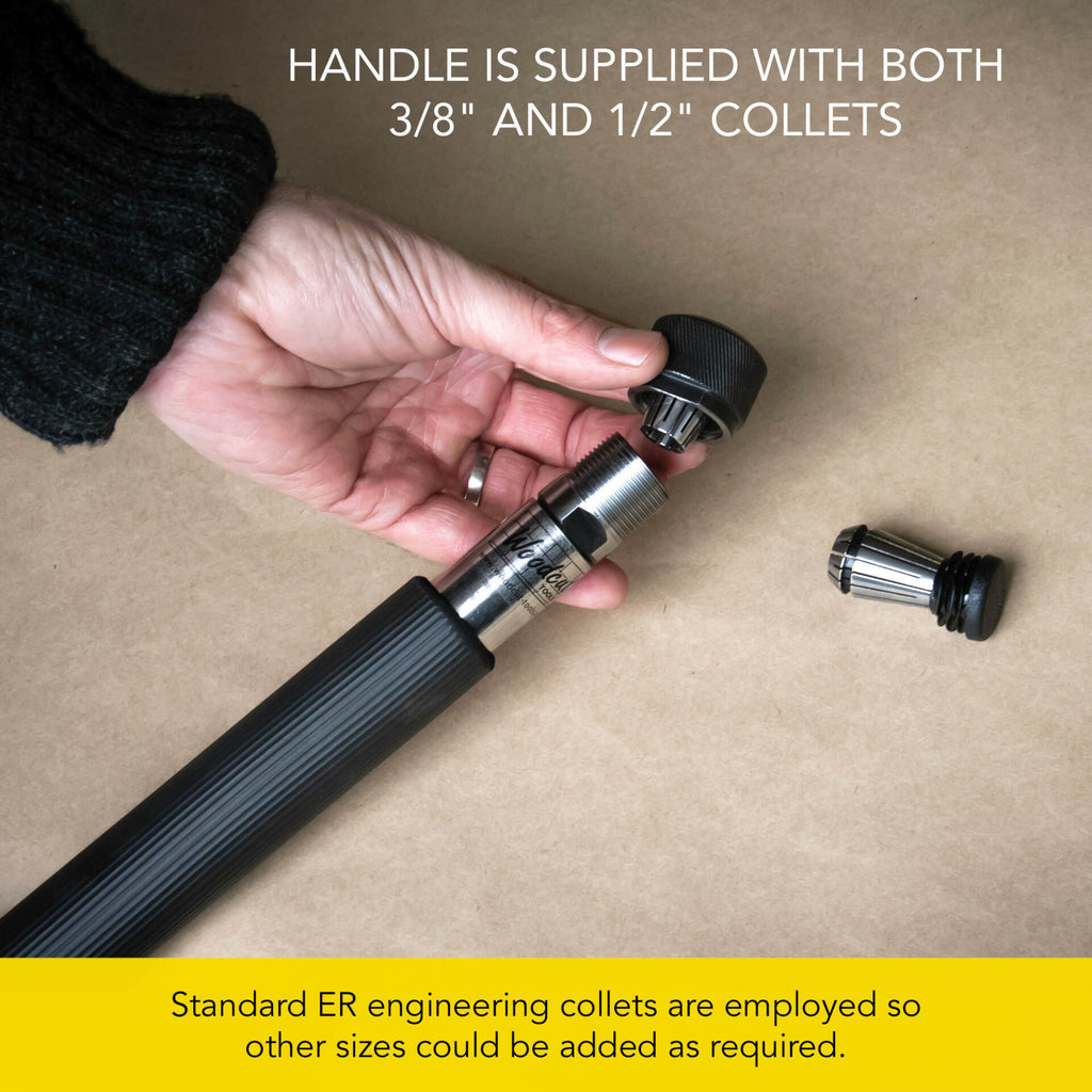 • EASILY INTERCHANGE MULTIPLE TOOLS - The two collets provided enable this tool to be used with both 3/8" (10mm) and 1/2" (12.7mm) tool shafts. Standard ER engineering collets are employed so other sizes could be added as required. The beautifully engineered collet chuck ejects the collet for quickly removing or adjusting the tool shaft. A simple twist of the collar loosens or tightens.