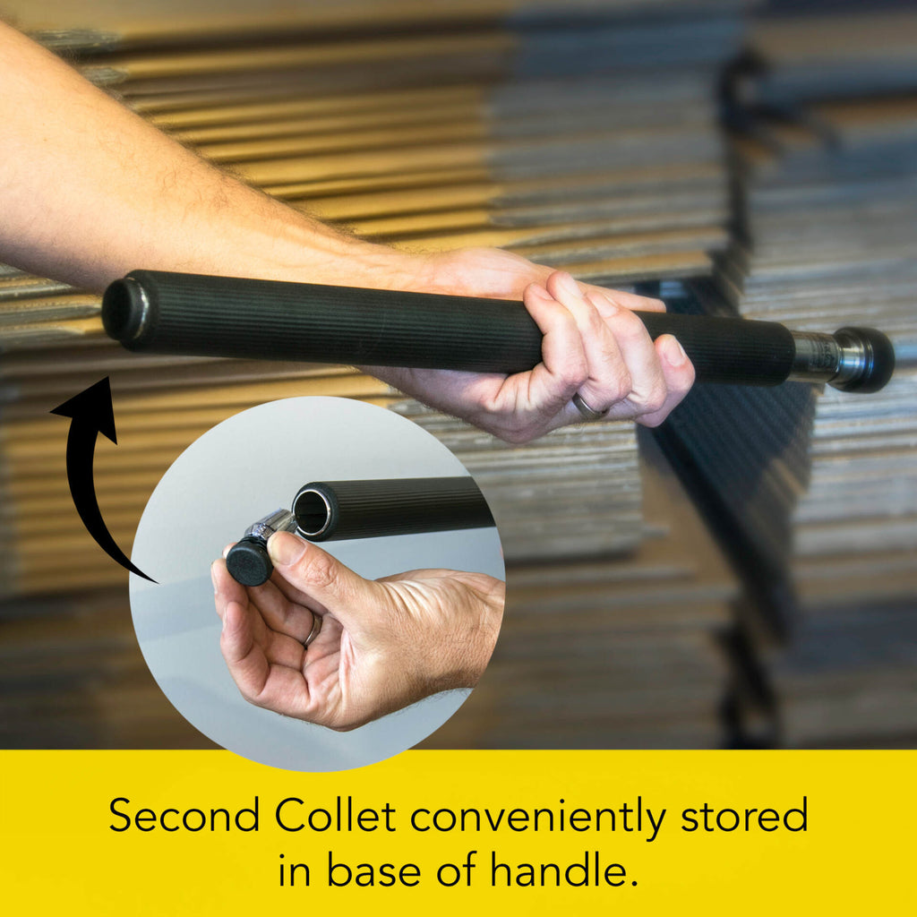 • TWO COLLETS PROVIDED - 3/8" and 1/2" collets are provided. Collets are made from metal, not plastic. The collet not being used is simply stored conveniently in the opposite end of the handle. Remove the plug at base of handle to find the second collet stored on a handy magnet.