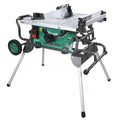 High performance worksite table saw with huge cutting capacity that includes a wheeled stand with foldout legs for easy transportation from site to site.