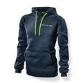 Navy blue Festool hoodie with drawstring in green. Features fleecy lining and kangaroo pocket on front, knitted cuffs and waist band. Material: 60% cotton, 40% polyester.