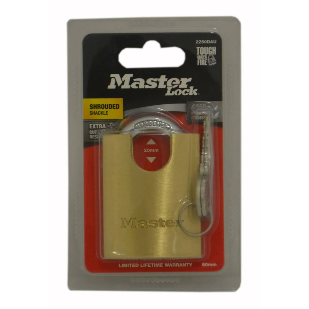 - Solid Brass padlock with shrouded shackle features a 50mm wide solid brass lock body that is strong, durable and resists corrosion