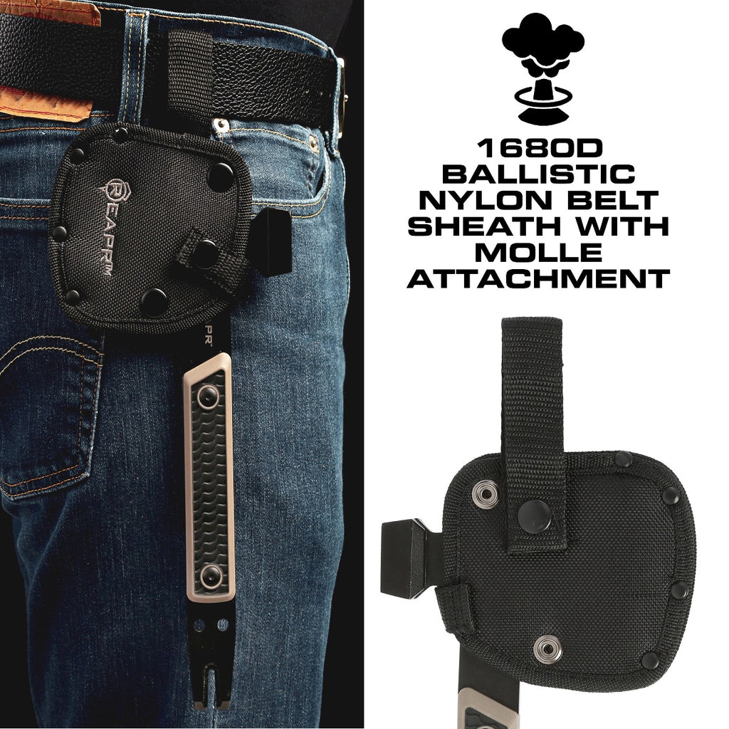 Similar to standard camping axes and hatchets in size, the Versa stands out from the pack to give you not only a 3″ axe head, but a 3-wrench set (10 mm, 13 mm, 16mm), cast hammer, pry bar, nail puller and a bottle opener. Constructed of full tang black powder coated 420 stainless steel, the axe head is a solid 4mm thick. The nonslip TPR molded handle helps ensure secure, comfortable handling An above-military-grade 1680D ballistic nylon sheath includes a MOLLE attachment, for easy attachment to your tactical pack, and a dual lanyard hole gives you versatility in your storage.