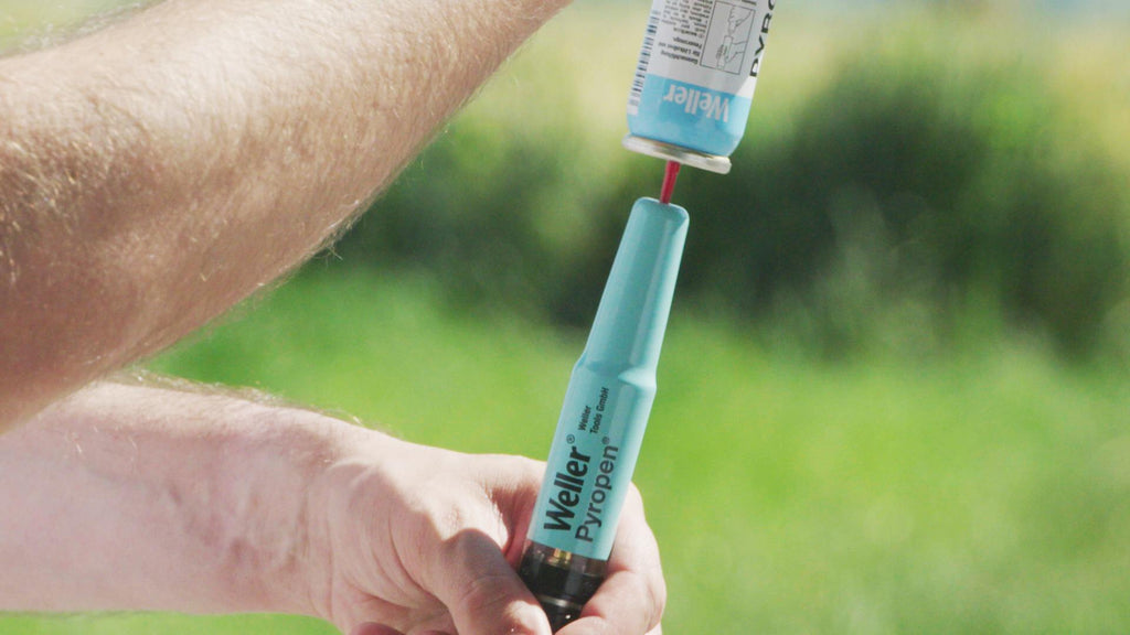 The Weller Cordless Pyropen is a manually ignited, butane gas operated, soldering iron with solder, hot blow and blow torch functions. Its ideal to for soldering on the go and helps to complete soldering tasks anywhere, without the need for a mains supply or an obstructing cable. The Butane gas soldering iron has a rapid heat up time and duration of operation from one filling of approximately 3 hours. It offers temperature adjustment variable between 200°C to 500°C when used as a soldering iron and up to 650°C when used as a hot air blower and 1300°C when used as a blow torch.